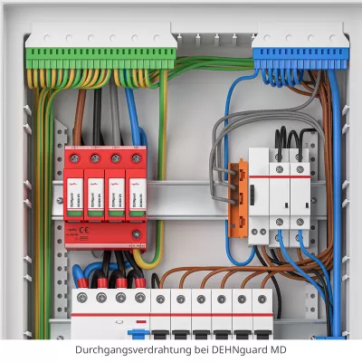 Der Doppelschraubanschluss in Durchgangsverdrahtung ersetzt vorgelagerte Klemmblöcke und reduziert Material- und Arbeitsaufwände bei der Installation. Die DEHNguard MD-Serie lässt sich deshalb unkompliziert in bestehende Anlagen integrieren.