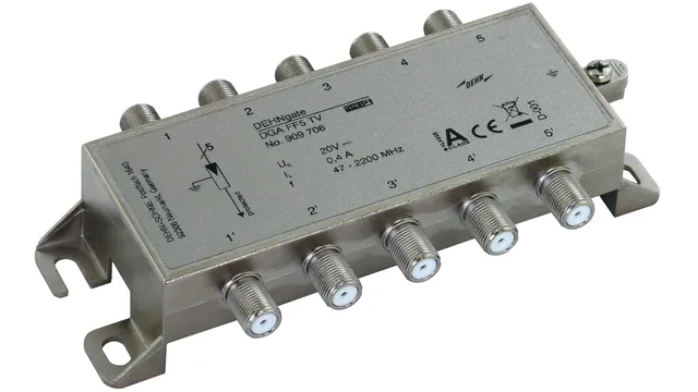 Limitatori di sovratensione a 5 moduli con connettori F per impianti satellitari 75 Ohm. Il limitatore corrisponde ai requisiti elevati di schermatura della classe A secondo EN 50 083-2.