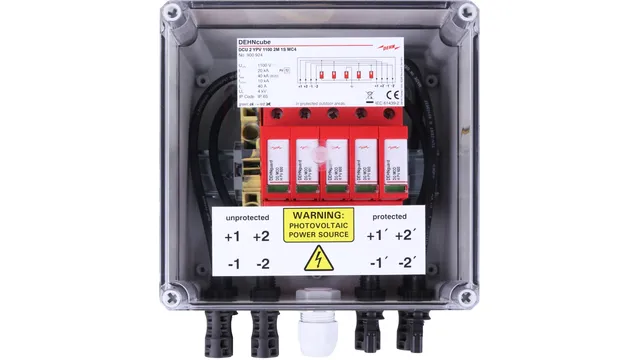 La soluzione per impianti fotovoltaici DEHNcube, pronta per il collegamento, protegge gli inverter e i moduli fotovoltaici dalle sovratensioni. Il box di connessione del generatore è disponibile per applicazioni a 1 MPP, 2 MPP e 3 MPP e per i più comuni tipi di inverter. Con connessione originale a spina MC4 o con tecnologia di connessione a vite / ingresso cavi.