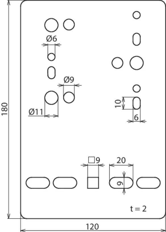 | Befestigungsbohrungen für Gitterbahn | Gitterbahn [4x] 9 x 20 / [1x] 9 x 9 mm |