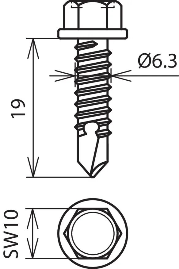 Selbstschneidend mit Sechskantkopf und Bund, für den Anschluss von Überbrückungslaschen, -bändern oder -seilen z. B. an die Attika (bei Materialstärken ≥ 2 mm).