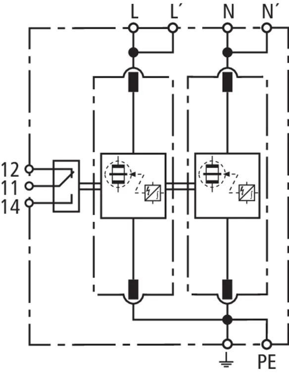 Modularer Kombi-Ableiter für einphasige TN-Systeme mit 230 V Nennspannung (2+0-Schaltung); in der Ausführung FM mit potentialfreiem Fernmeldekontakt.