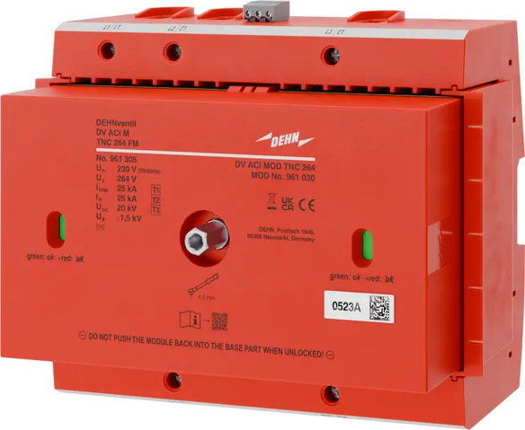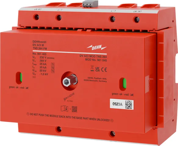 - Anschlussfertiger Kombi-Ableiter Typ 1 + Typ 2 + Typ 3 auf Funkenstreckenbasis, bestehend aus Basisteil und einem einzelnen gesteckten Schutzmodul