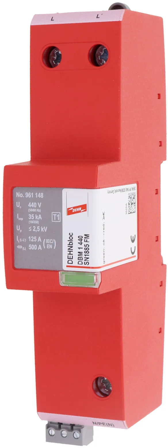 Koordinierter, einpoliger Blitzstrom-Ableiter zum Einsatz in 400 / 690 V-Systemen; in der Ausführung FM mit potentialfreiem Fernmeldekontakt.
