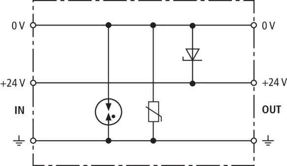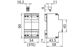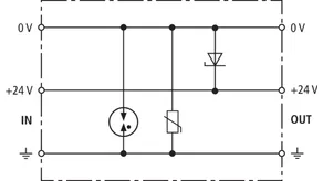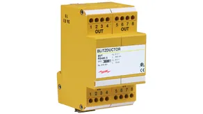 Energetisch koordinierter Kombi-Ableiter zum Schutz des Gleichrichters im Schutzstromkreis (Farbe rot). Steckbarer Fernmeldekontakt (Öffner) für Überlast-Anzeige (Thermoüberwachung der Varistoren). Einbau im Stahlblechgehäuse empfohlen. Durch kapazitive Steuerung wird eine niedrige Impuls-Ansprechspannung erreicht.