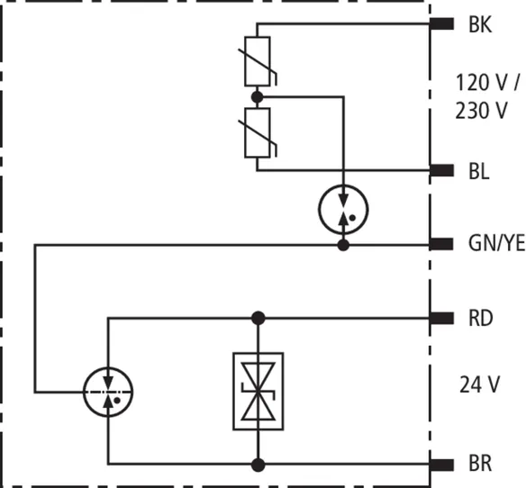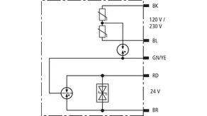 Überspannungs-Ableiter in kombinierter Ausführung für Energie und Datenseite. Druckfeste Kapselung zum Einsatz in explosionsgefährdeten Bereichen in Zone 1 und 2, zum Schutz einer 120 / 230 V-Netzversorgungs- und einer 24 V-Datenschnittstelle von Feldgeräten.