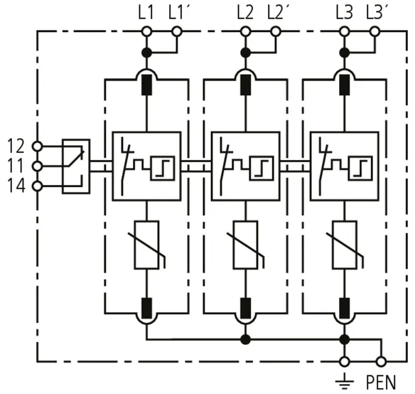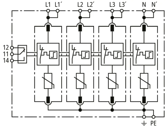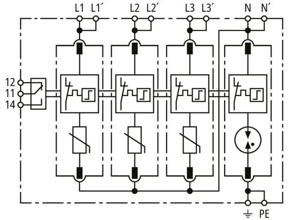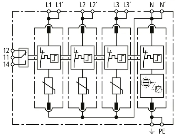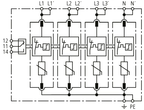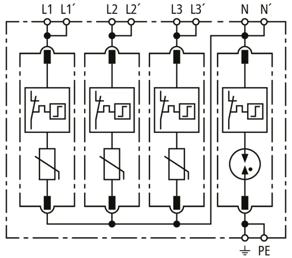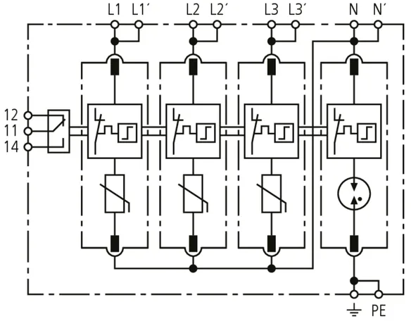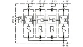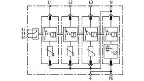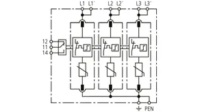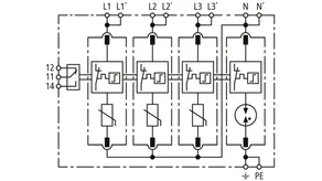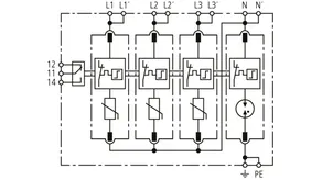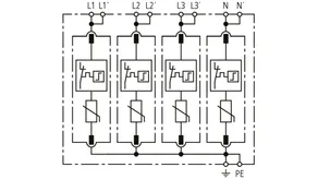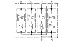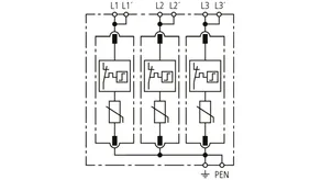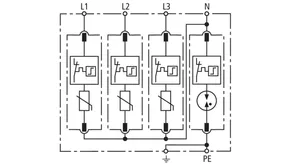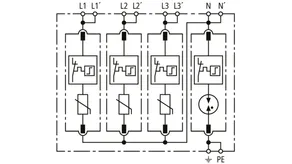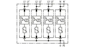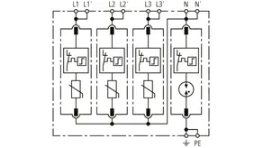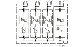 Modularer Überspannungs-Ableiter mit hohem Summen-Ableitvermögen im N-PE-Pfad für TT- und TN-S-Systeme (3+1-Schaltung). Erfüllt die höheren Sicherheitsanforderungen nach DIN VDE 0100-534 für den Einsatz am Speisepunkt der elektrischen Anlage; mit potentialfreiem Fernmeldekontakt.