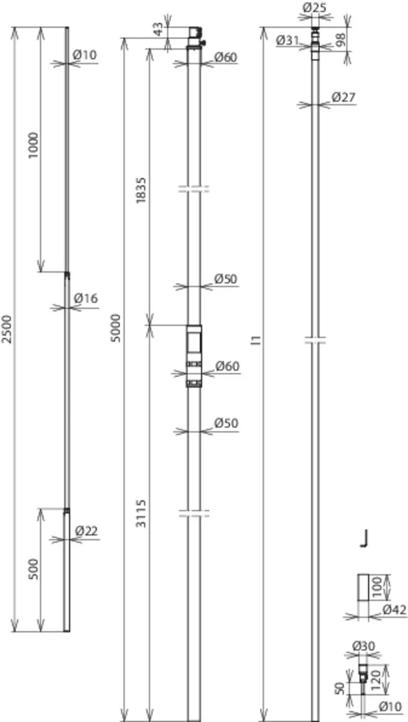 | Max. freie Länge mit Fangstange (Wandmontage) | 5000 mm |