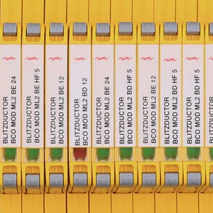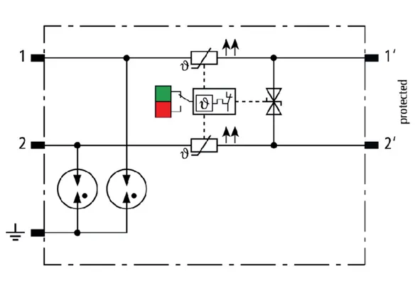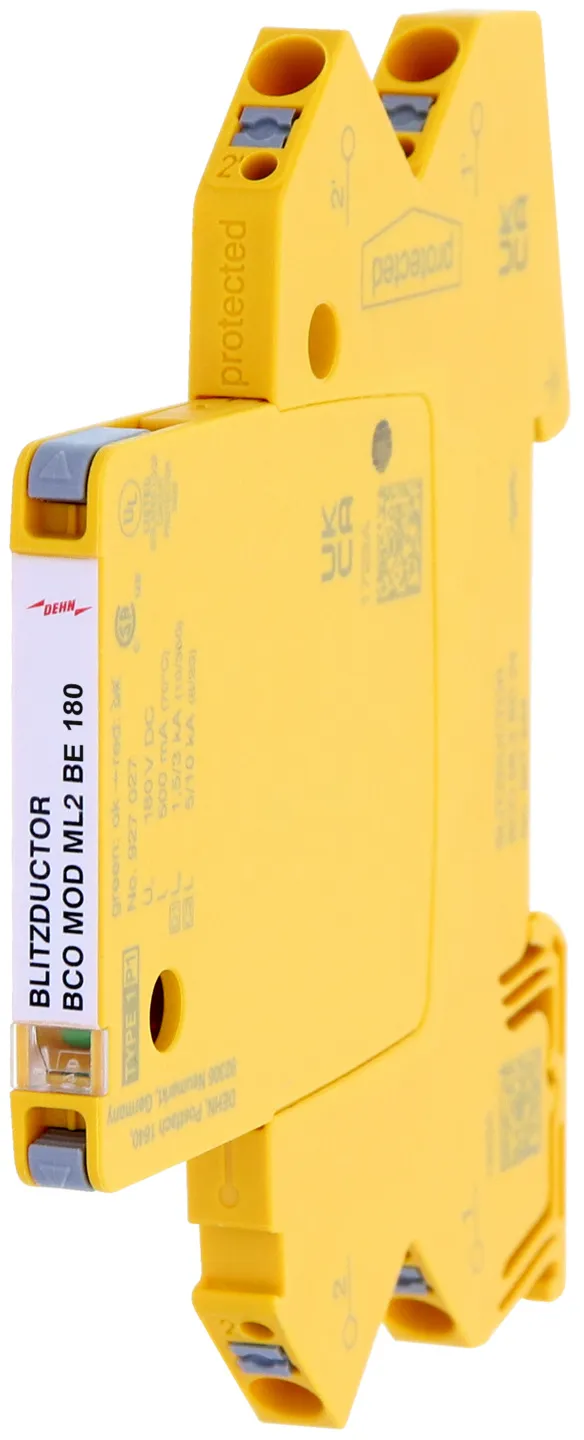 Platzsparender, modularer Kombi-Ableiter in 6 mm Baubreite und Push-In Anschlusstechnik mit Statusanzeige zum Schutz von 1 Doppelader in 24 V DC Systemen. Einsatz geeignet auch bei geerdetem Minuspol, integrierte PTC-Widerstände ermöglichen ein sicheres Rücksetzen des Ableiters nach Störbeeinflussung im Anlagenkreis mit Kurzschlussströmen bis 40 A. Mit Signaltrennung für Wartungszwecke.