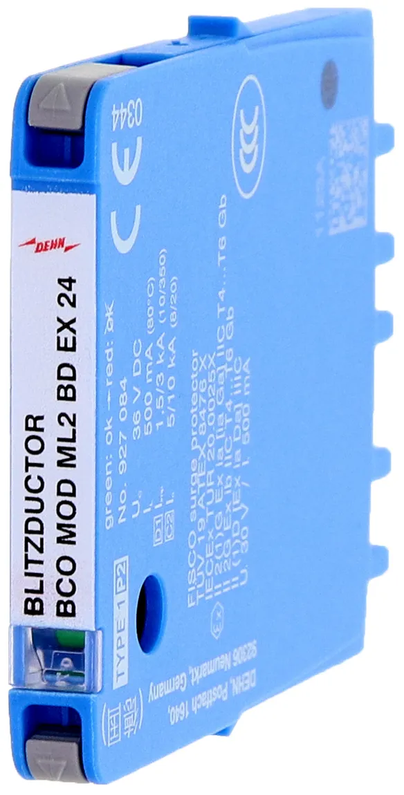 Kombi-Ableiter Schutzmodul in 6 mm Baubreite für BLITZDUCTORconnect mit Statusanzeige zum Schutz von 1 Doppelader in 24 V DC Systemen. Einsatz geeignet auch bei geerdetem Minuspol. Integrierte PTC-Widerstände ermöglichen ein sicheres Rücksetzen des Ableiters nach Störbeeinflussung im Anlagenkreis mit Kurzschlussströmen bis 40 A.