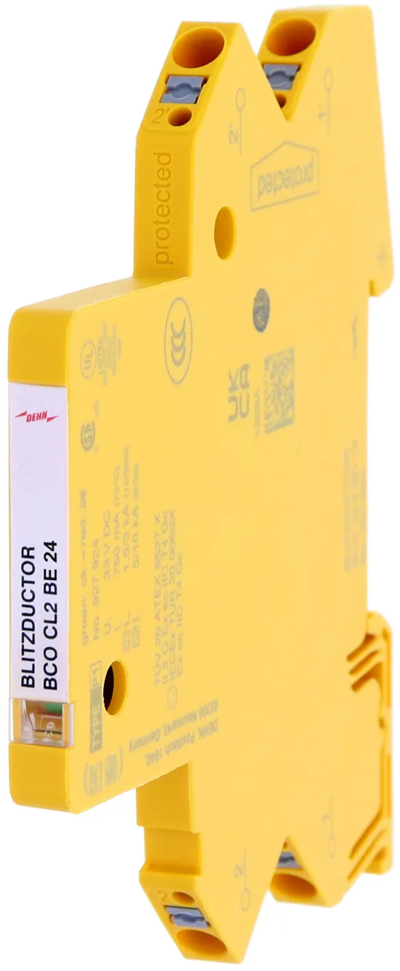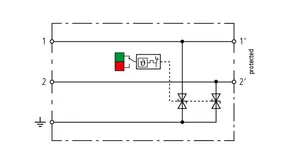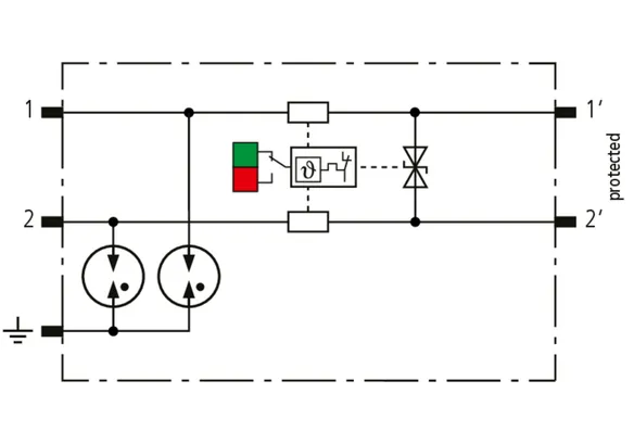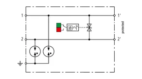 Platzsparender, kompakter Überspannungs-Ableiter in 6 mm Baubreite und Push-In Anschlusstechnik mit Statusanzeige. Fein begrenzender, einstufiger Überspannungsschutz mit leistungsfähigen Dioden zum Schutz von 2 Einzeladern mit gemeinsamen Bezugspotential sowie unsymmetrischer Schnittstellen.
