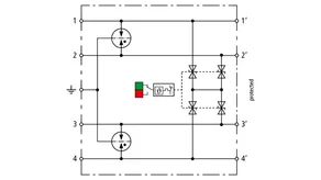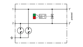 Platzsparender, kompakter Überspannungs-Ableiter in 6 mm Baubreite und Push-In Anschlusstechnik mit Statusanzeige. Fein begrenzender, einstufiger Überspannungsschutz mit leistungsfähigen Dioden zum Schutz von 2 Einzeladern mit gemeinsamen Bezugspotential sowie unsymmetrischer Schnittstellen.