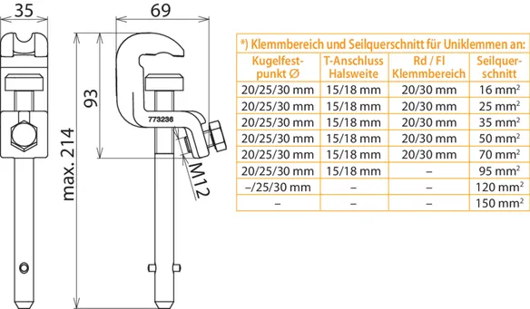 | *) siehe Tabelle Klemmbereich und max. Seilquerschnitt für Universalklemmen | |