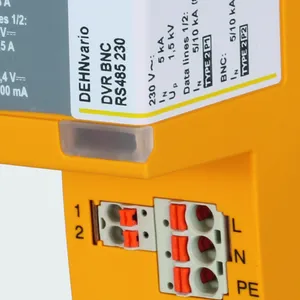 Kompakter 3in1-Überspannungs-Ableiter zum Schutz von analogen Kamerasystemen. Schutz des Videosignals (BNC-Anschluss), eines Datensignals (RS485) und einer Spannungsversorgung (230 V AC). Schneller und werkzeugloser Leiteranschluss durch Direktstecktechnik. Die Anschlussklemmen-Einheiten können zum einfachen Ableiterwechsel entriegelt und aus dem Gehäuse entnommen werden. Mit einfacher Überlastanzeige (230 V).