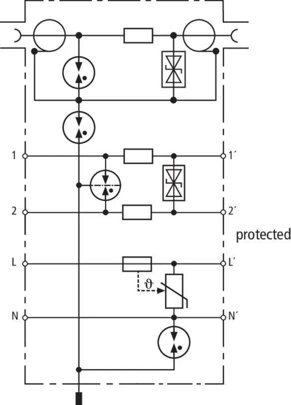 Kompakter Kombi-Ableiter zum Schutz von elektroakustischen Anlagen (z. B. Sprachalarmierung, Lautsprechersysteme). Schutz von einer Doppelader mit galvanischer Trennung mit der Möglichkeit zur direkten oder indirekten Schirmerdung. Schneller und werkzeugloser Leiteranschluss durch Direkt-Stecktechnik. Die Anschlussklemmen-Einheiten können zum einfachen Ableitertausch entriegelt und aus dem Gehäuse entnommen werden. Mit integriertem Fernmeldekontakt (Öffnerkontakt).