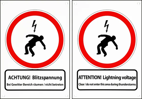 Plaque signalétique Attention Tension de foudre Plaque signalétique Impression en allemand au recto : « ACHTUNG! Blitzspannung Bei Gewitter Bereich räumen / nicht betreten » Impression en anglais au verso : « ATTENTION! Lightning voltage Clear / do not enter this area during thunderstorms »