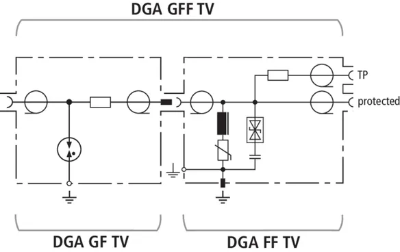 Les parafoudres DGA... TV sont des protections appropriées aux alimentations de systèmes de commande à distance et équipées d’un raccordement de type F pour installations SAT. Ces parafoudres sont disponibles en tant que parafoudre de type 1 combiné, parafoudre de type 1 coordonné et parafoudre de type 3 avec sortie de mesure intégrée pour le contrôle de l'installation.