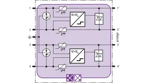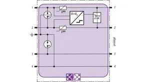 Parafoudre combiné présentant un faible encombrement avec la technologie actiVsense et RFID-LifeCheck pour la protection de deux paires avec une tension de service identique ou différente de deux interfaces symétriques avec séparation galvanique. Détection automatique de la tension de service du signal utile et ajustement optimisé du niveau de protection en fonction de la tension du signal.