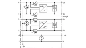 Parafoudre compact combiné dans un boîtier plastique en saillie avec la technologie actiVsense pour la protection de 2 paires avec une tension du signal identique ou différente, interfaces symétriques avec séparation galvanique, mise à la terre du blindage directe ou indirecte.