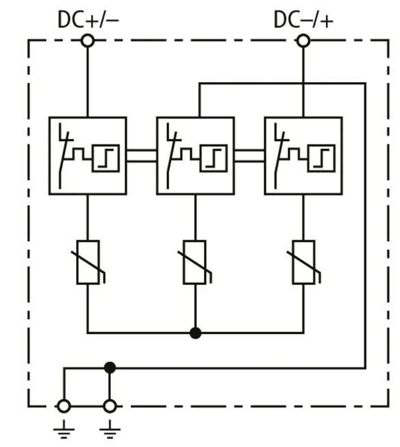 | Courant de choc de décharge (10/350 µs) [DC+/DC- -> PE] (Itotal ) | 12,5 kA |