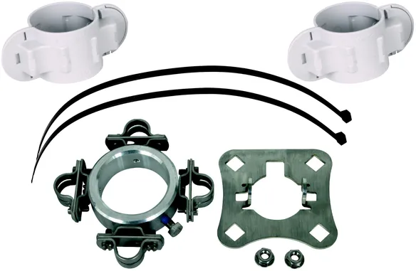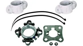 Kit de fixation pour le montage du conducteur HVI long aux tubes supports HVI long, comprenant une plaque de raccordement (4 éléments, y compris. deux écrous à embase crantée) et une bague de fixation avec quatre porte-câbles fendus (Ø20 mm) pour la terminaison d’extrémité (deux fixations pour câble incluses avec demi-pièces de support en plastique).