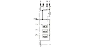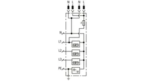 Parafoudre combiné pour les systèmes TN-C pour une utilisation dans les systèmes de distribution principaux (circuit 3+0) dans les bâtiments d’habitation avec protection externe contre la foudre (classe de protection contre la foudre III/IV), y compris les alimentations 230 V protégées contre la surcharge pour SpAS / PTC selon VDE-AR-N 4100.