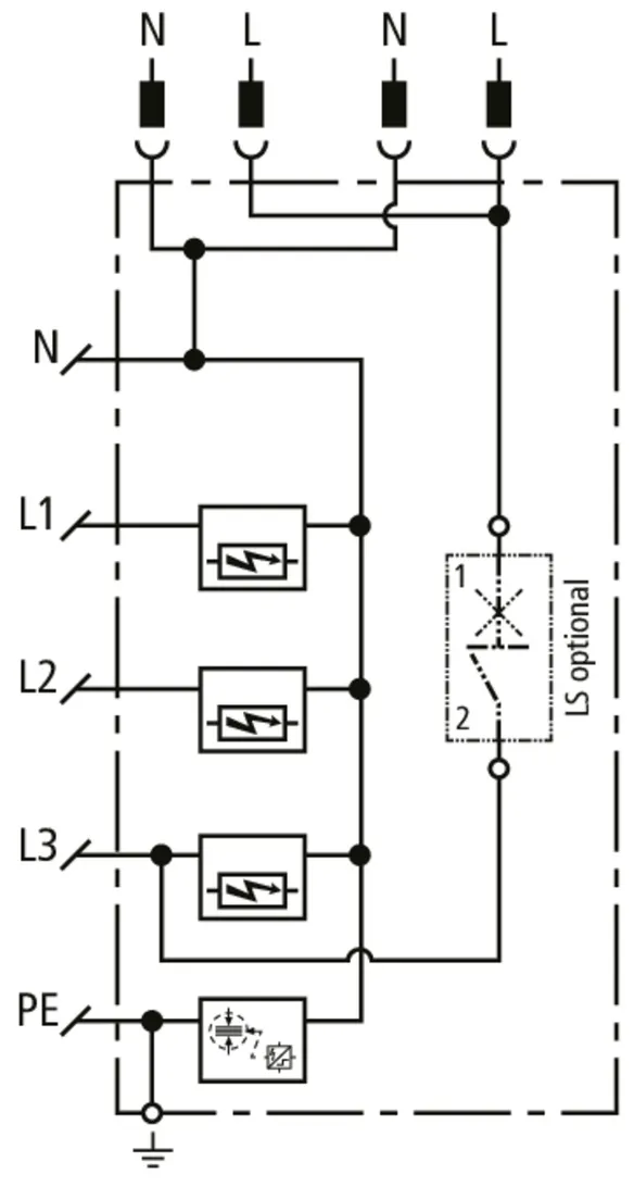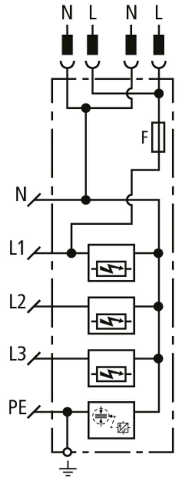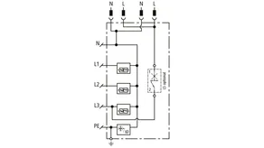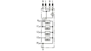 Parafoudre combiné pour les systèmes TN-S pour une utilisation dans les systèmes de distribution principaux (circuit 4+0) dans les bâtiments d’habitation sans protection externe contre la foudre (également avec alimentation par ligne aérienne), y compris les alimentations 230 V protégées contre la surcharge pour SpAS / PTC selon VDE-AR-N 4100.
