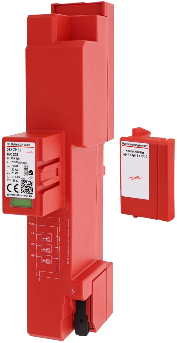 Parafoudre combiné pour les systèmes TN-S pour une utilisation dans les systèmes de distribution principaux (circuit 4+0) dans les bâtiments d’habitation avec protection externe contre la foudre (classe de protection contre la foudre III/IV), y compris les alimentations 230 V protégées contre la surcharge pour SpAS / PTC selon VDE-AR-N 4100.