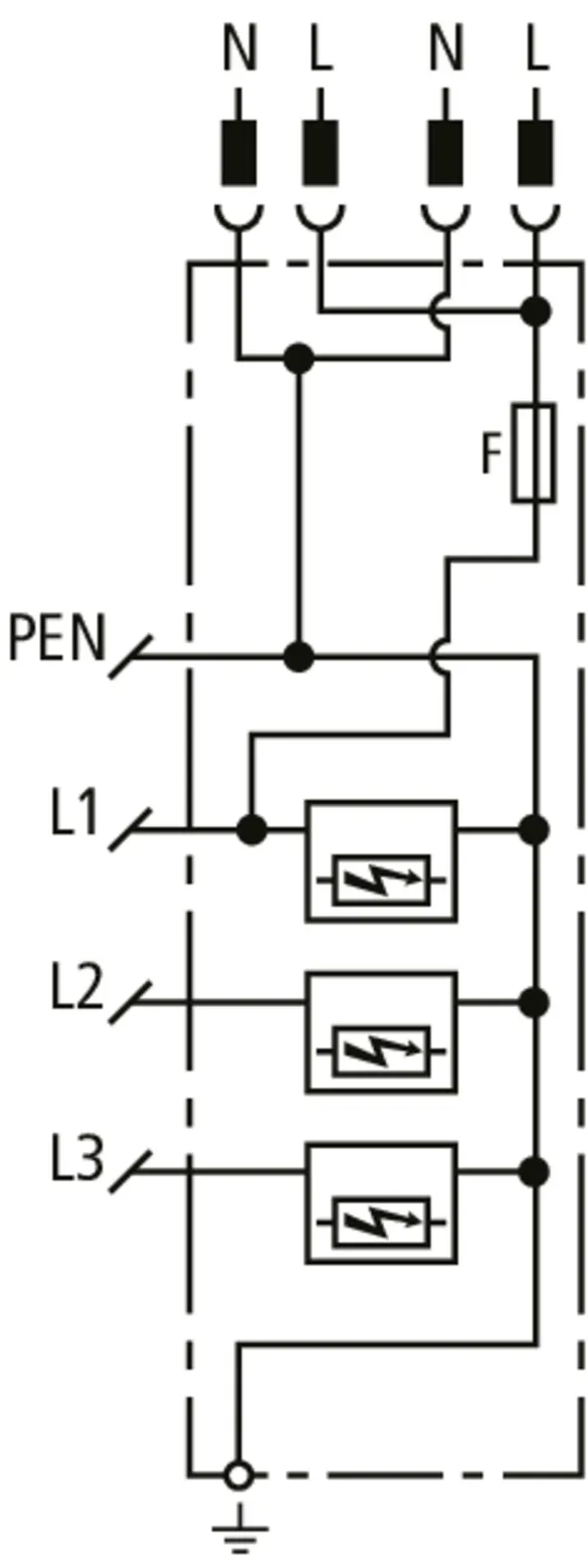 Parafoudre combiné pour les systèmes TN-C pour une utilisation dans les systèmes de distribution principaux (circuit 3+0) dans les bâtiments d’habitation sans protection externe contre la foudre (également avec alimentation par ligne aérienne), y compris les alimentations 230 V protégées contre la surcharge pour SpAS / PTC selon VDE-AR-N 4100.