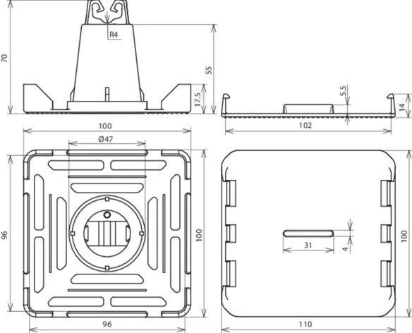 | Parte superiore in materiale plastico tipo KF Art. 253 016 separatamente su richiesta. | |
