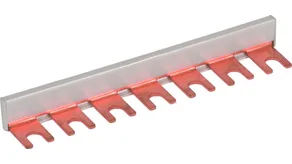 Pettine di collegamento per il ponticellamento di ad es. 3 moduli di protezione da sovratensioni in dimensioni d'innesto da 2 moduli, con morsetto di collegamento.