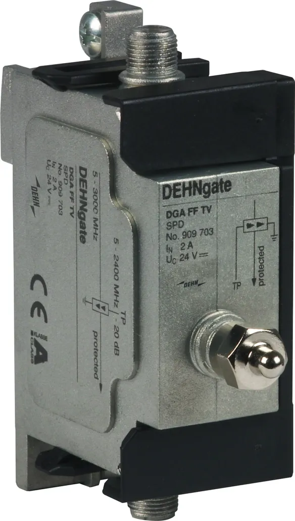 DGA ... TV sono limitatori adatti per alimentazioni remote con connettori "F" per impianti satellitari ed a banda larga a 75 Ohm. Gli scaricatori sono conformi alle richieste per la schermatura in classe A secondo EN 50083-2. Adatti per l'installazione con risparmio di spazio nelle più comuni applicazioni TV e SAT sono disponibili le esecuzioni di scaricatore per corrente di fulmine come anche limitatore di sovratensione oppure scaricatore combinato con integrata presa per misure per le prove nell'impianto.