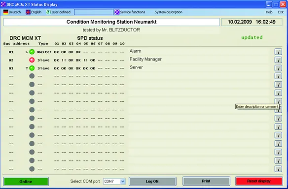 In alternativa può essere utilizzato, con l'ausilio del convertitore d'interfaccia RS 485, il software gratuito "Status Display e Service Console". Con il software è possibile visualizzare in forma protetta su PC lo stato di tutti gli scaricatori monitorati. Si può scaricare il software nell'area download sul sito www.dehn.it.