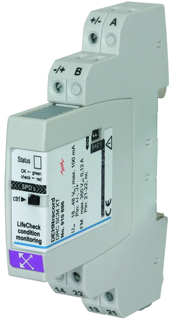 Apparecchio modulare con sensore RFID-LifeCheck integrato, per il controllo di stato fino a max 10 BLITZDUCTOR XT/XTU con RFID-LifeCheck. Indicazione ottica di funzionamento, LED a 3 colori, degli scaricatori, combinata con segnalazione a distanza (FM) (contatto in apertura oppure in chiusura). Tramite l'interfaccia integrata RS485 è possibile monitorare fino a 15 DRC MCM XT in un sistema con un massimo di 150 scaricatori  BLITZDUCTOR XT/XTU.