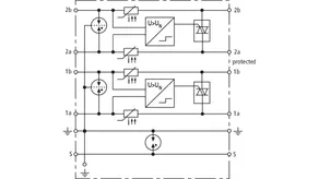 Scaricatore combinato in scatola in materiale plastico per montaggio a parete, con tecnologia actiVsense, per la protezione di 2 coppie di fili di interfacce simmetriche con separazione galvanica, a tensione uguale oppure diversa, con possibilità della messa a terra diretta oppure indiretta.