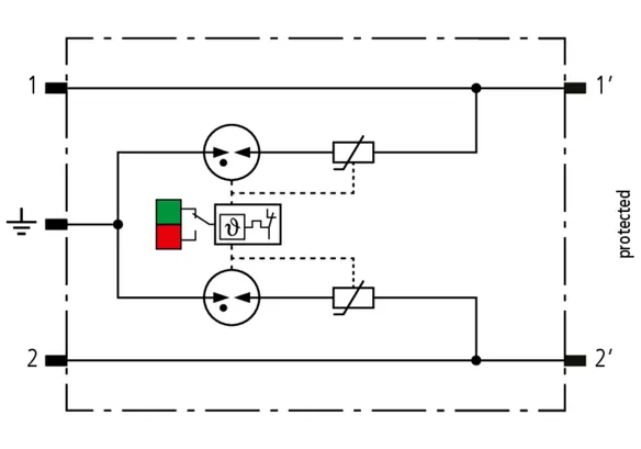 Scaricatore combinato modulare a risparmio di spazio con larghezza d’installazione di 6 mm e tecnica di connessione Push-in con indicazione di stato, per la protezione di 1 filo doppio in sistemi a 24 V DC. Impiego adatto anche con polo negativo di terra; le resistenze PTC integrate permettono un ripristino sicuro del SPD in seguito ad interferenza nel circuito dell’impianto con correnti di cortocircuito fino a 40 A. Con separazione di segnale per scopi di manutenzione.
