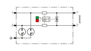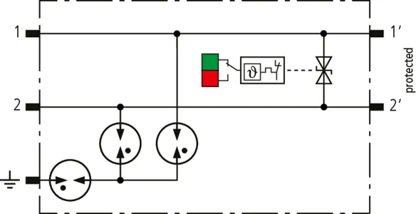 Scaricatore combinato modulare a risparmio di spazio con larghezza d’installazione di 6 mm e tecnica di connessione Push-in con indicazione di stato, per la protezione di 1 filo doppio in sistemi a 24 V DC. Impiego adatto anche con polo negativo di terra; le resistenze PTC integrate permettono un ripristino sicuro del SPD in seguito ad interferenza nel circuito dell’impianto con correnti di cortocircuito fino a 40 A. Con separazione di segnale per scopi di manutenzione.