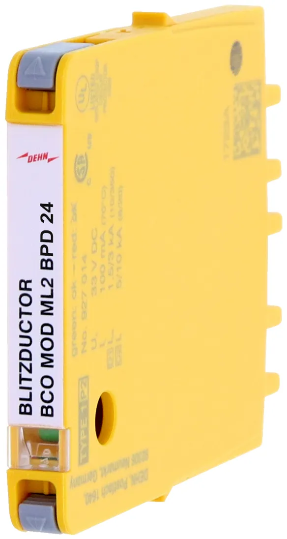 Scaricatore combinato modulo di protezione, larghezza di installazione 6 mm per BLITZDUCTORconnect con indicatore di stato per la protezione di 1 coppia di fili in sistemi a 24 V DC. Impiego adatto anche con polo negativo messo a terra. Le resistenze PTC integrate permettono un ripristino sicuro dell’SPD in seguito ad interferenza nel circuito dell’impianto con correnti di cortocircuito fino a 40 A.