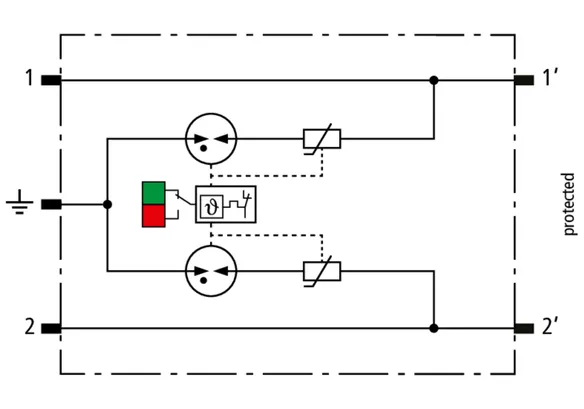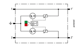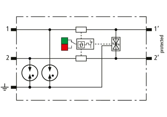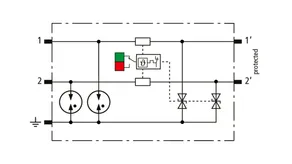 Scaricatore combinato modulare a risparmio di spazio con larghezza d’installazione di 6 mm e tecnica di connessione Push-in con indicazione di stato, per la protezione di 1 filo doppio in sistemi a 24 V DC. Impiego adatto anche con polo negativo di terra; le resistenze PTC integrate permettono un ripristino sicuro del SPD in seguito ad interferenza nel circuito dell’impianto con correnti di cortocircuito fino a 40 A. Con separazione di segnale per scopi di manutenzione.