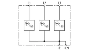 Scaricatore combinato per reti TN-C, pronto per il cablaggio ed ottimizzato nell'applicazione per l'impiego nella distribuzione principale (circuito 3+0) in edifici residenziali senza impianto parafulmine esterno (anche con alimentazione della linea aerea); con contatto di telesegnalamento a scambio pulito.