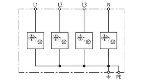 Scaricatore combinato per reti TN-S, pronto per il cablaggio ed ottimizzato nell'applicazione per l'impiego in sistema di alimentazione principale (circuito 4+0) in edifici residenziali senza impianto parafulmine esterno (anche con alimentazione della linea aerea); con contatto di telesegnalamento a scambio pulito.