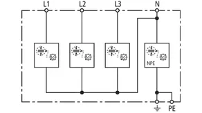 Scaricatore combinato per reti TN-C, pronto per il cablaggio ed ottimizzato nell'applicazione per l'impiego nella distribuzione principale (circuito 3+0) in edifici residenziali senza impianto parafulmine esterno (anche con alimentazione della linea aerea); con contatto di telesegnalamento a scambio pulito.