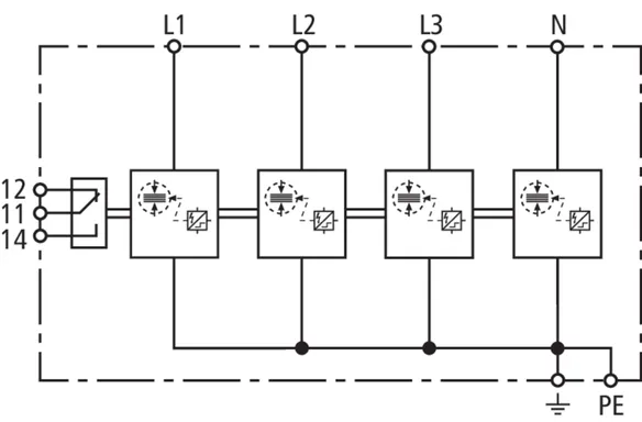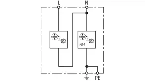 Scaricatore combinato per reti TN, pronto per il cablaggio ed ottimizzato nell'applicazione per l'impiego in sistema di alimentazione principale (circuito 2+0) in edifici residenziali senza impianto parafulmine esterno (anche con alimentazione della linea aerea); con contatto di telesegnalamento a scambio pulito.